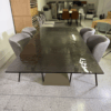 Tavolo allungabile rettangolare con base in metallo perla beige e piano in vetro martellato bronzo trasparente.