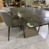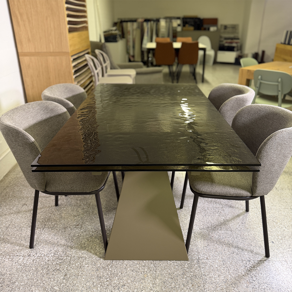 Ilย tavolo allungabile rettangolare Waters รจ caratterizzato dalla struttura in metallo verniciato perla beige e dal piano in vetro martellato bronzo trasparente, capace di creare giochi di luce e riflessi unici.