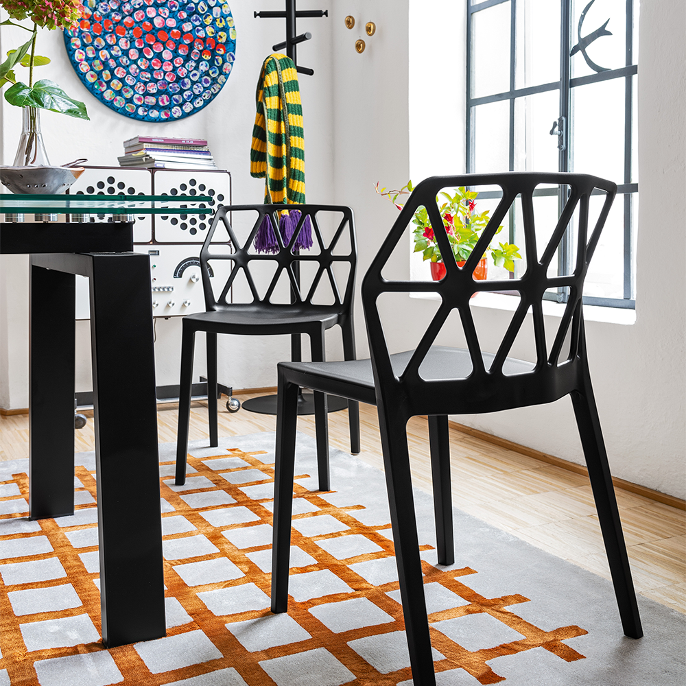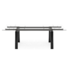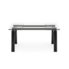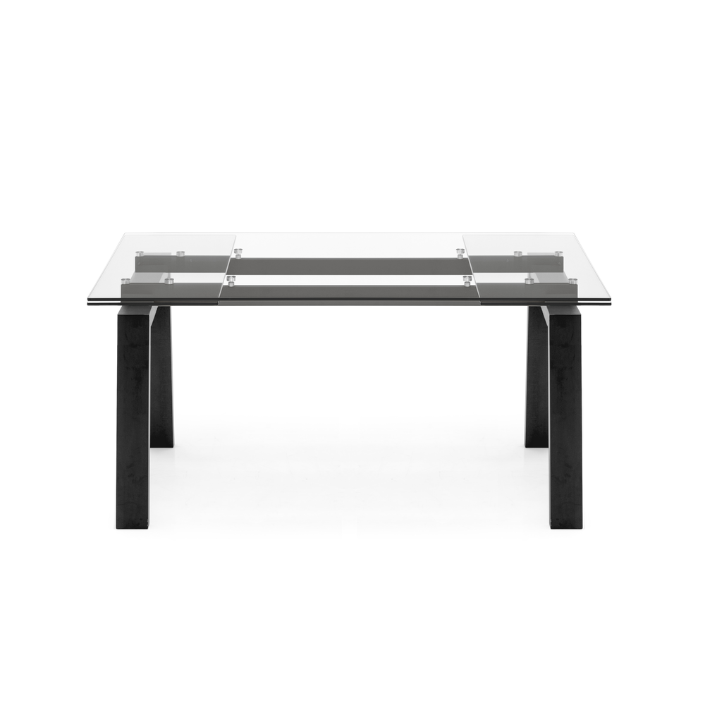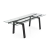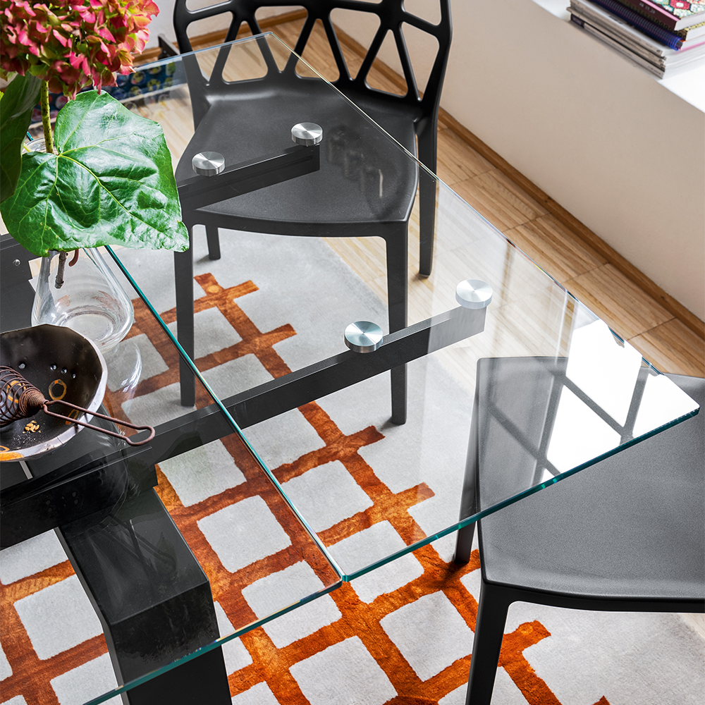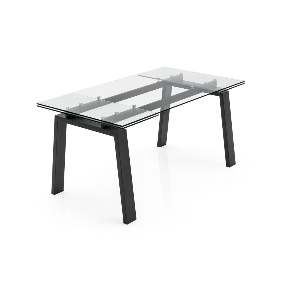 Nella versione con struttura nero opaco, il piano rettangolare e le allunghe sono realizzati in vetro trasparente con guide nere, creando un insieme deciso e contemporaneo.
