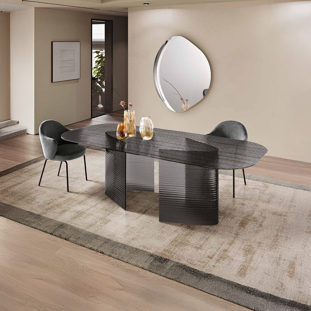 Il tavolo fisso Lovely è un tavolo in vetro trasparente rigato, disponibile in due varianti: bronzo o fumé.