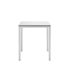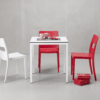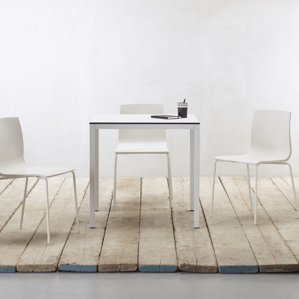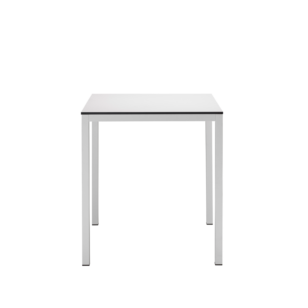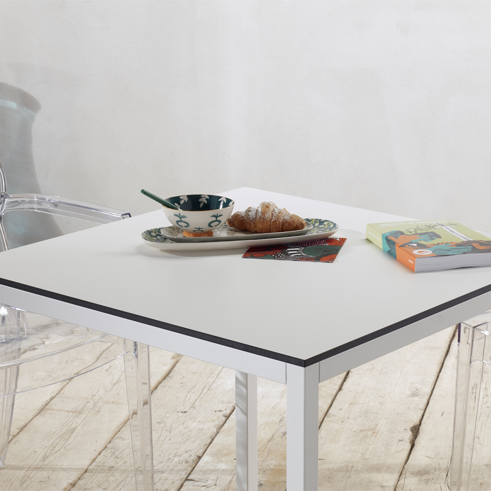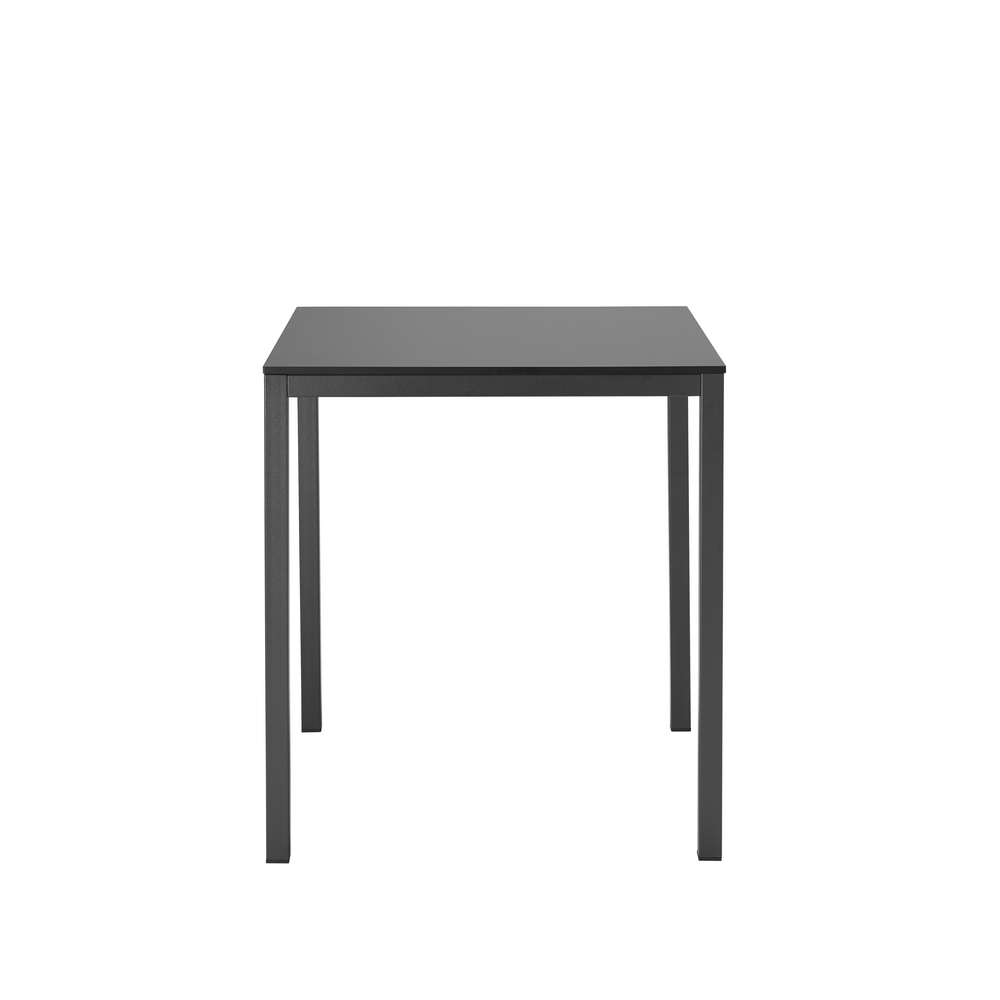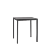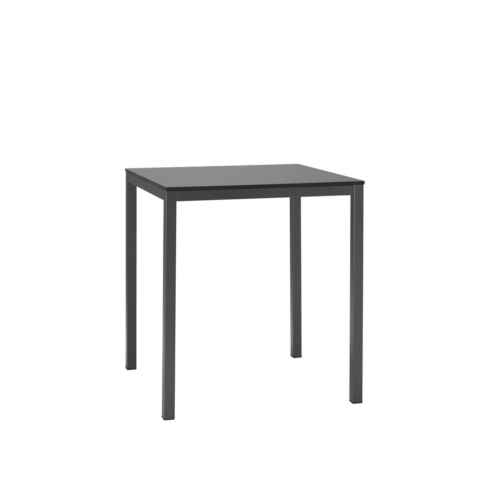 Tavolo fisso impilabile con piano quadrato in HPL stratificato compact e struttura in acciaio zincato. Adatto ad uso interno ed esterno.