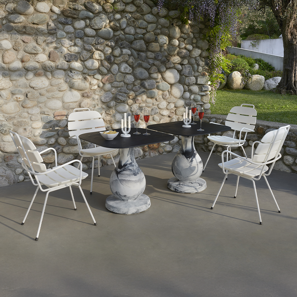 La struttura in polietilene arabescato, robusta e resistente agli agenti atmosferici, offre stabilità e praticità, mentre il piano in HPL è disponibile in wengé, ardesia, cementino e calacatta per adattarsi con facilità a gusti e contesti diversi.
