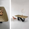Il tavolo fisso rettangolare Karl รจ dotato di una solida struttura in metallo verniciato, proposta nei colori perla beige, bronzo e nero, che si abbina armoniosamente ai diversi materiali del piano.