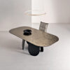 Tavolo fisso rettangolare con base in metallo verniciato nero o perla beige e piano in vetro martellato retroargentato. Disponibile in due dimensioni e vari colori.