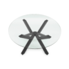 Tavolo fisso rotondo con struttura in faggio e piano in vetro temperato trasparente.