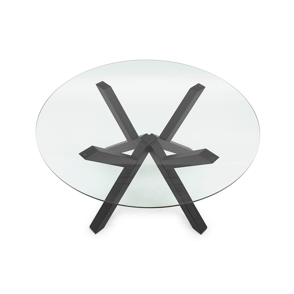 La struttura รจ realizzata in legno di faggio, disponibile in diverse finiture, mentre il piano รจ in vetro temperato trasparente, che lascia intravedere la particolare geometria della base.