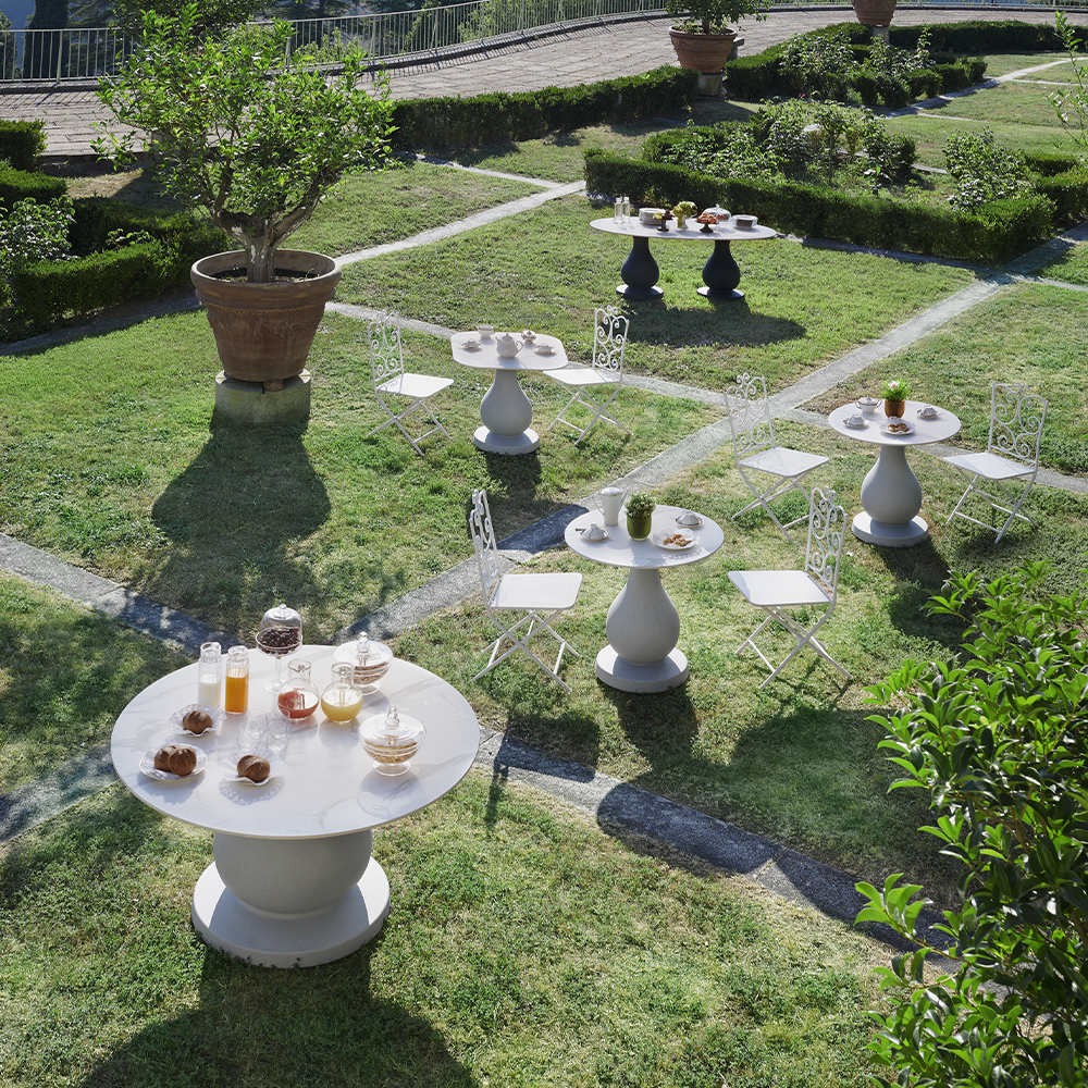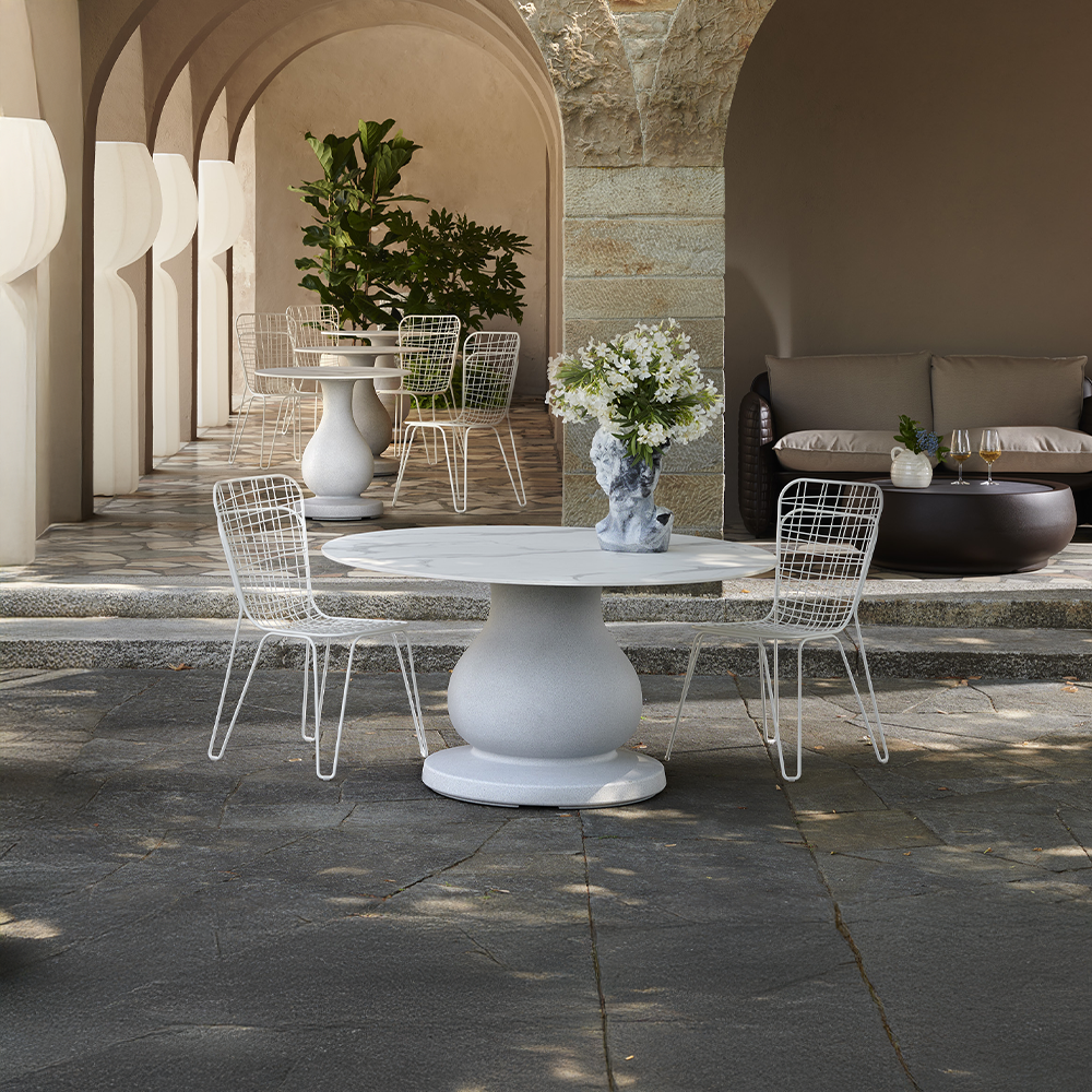La forma rotonda favorisce una disposizione armoniosa degli spazi e rende il tavolo ideale per momenti conviviali in case private, locali, terrazze, giardini o ambienti contract.