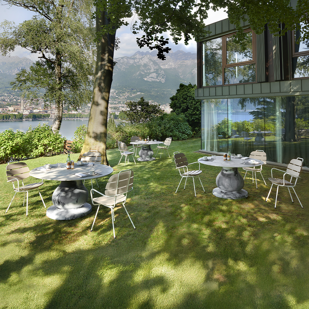La forma rotonda favorisce una disposizione armoniosa degli spazi e rende il tavolo ideale per momenti conviviali in case private, locali, terrazze, giardini o ambienti contract.