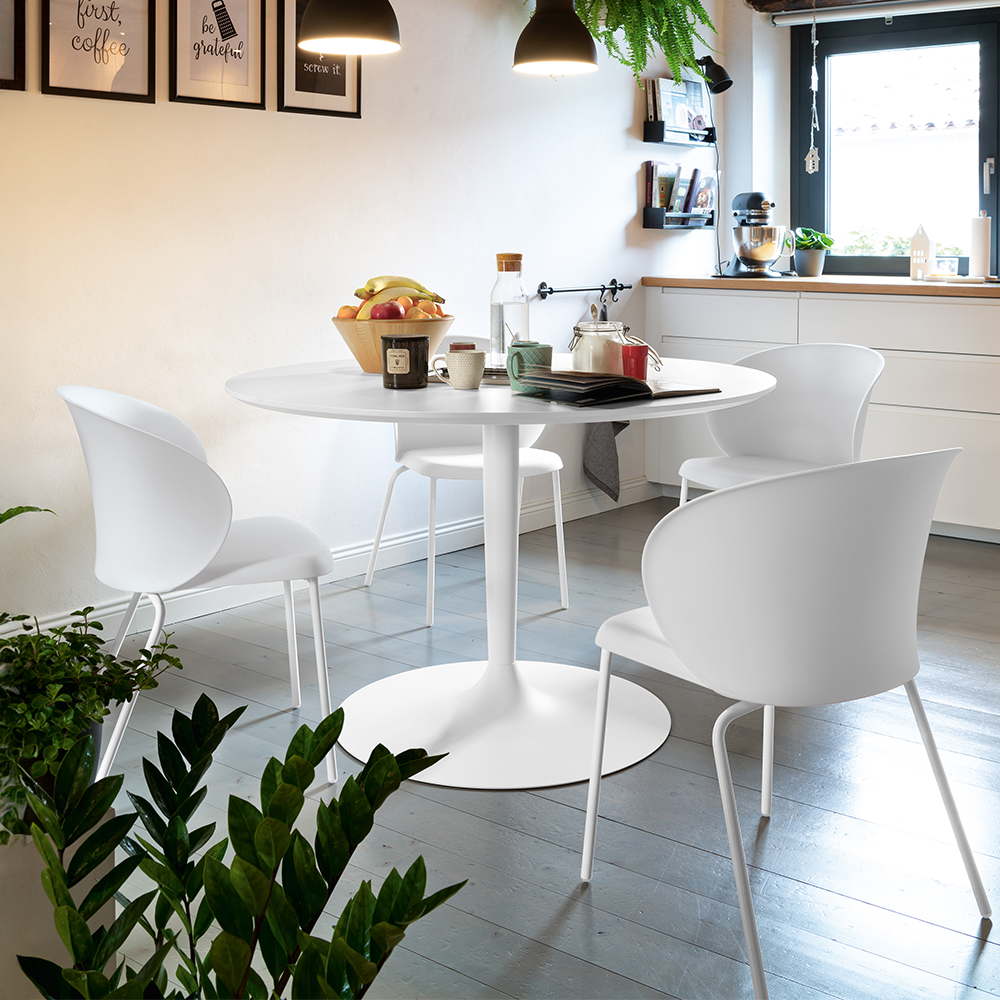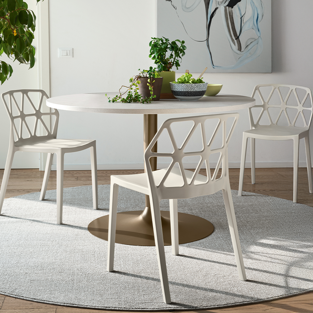La struttura in metallo verniciato assicura stabilità, mentre il piano rotondo è disponibile in laminato HPL con bordo nero, nobilitato, vetro temperato oppure in finitura laccata, consentendo diverse configurazioni in base allo stile dell’ambiente.