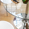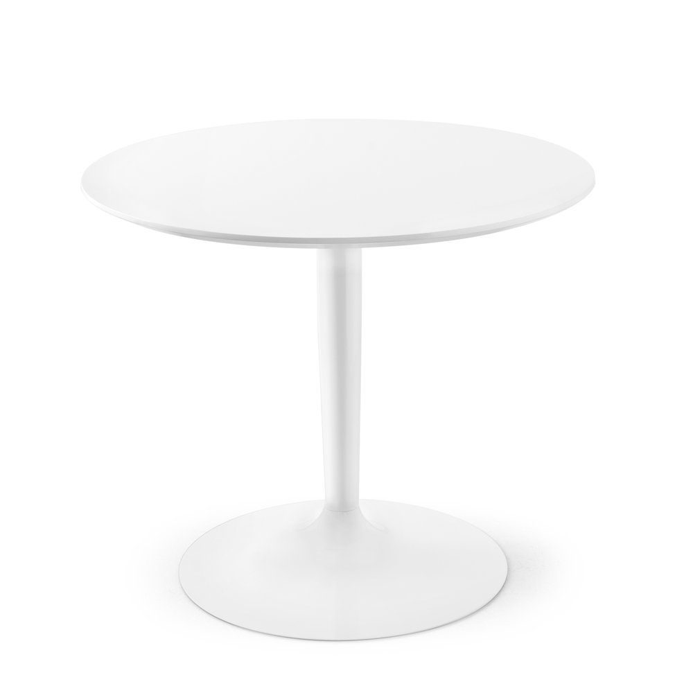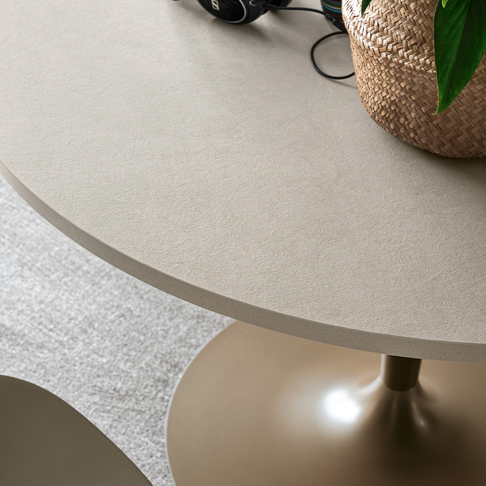 Tavolo fisso rotondo con struttura in metallo e piano in laminato HPL, nobilitato, vetro temperato o laccato.