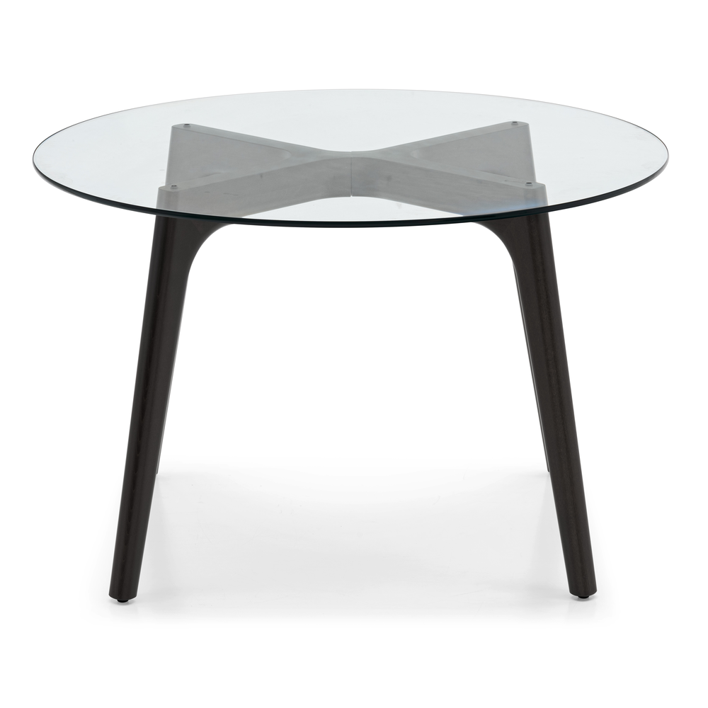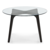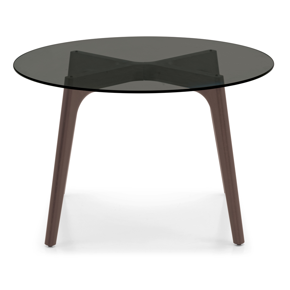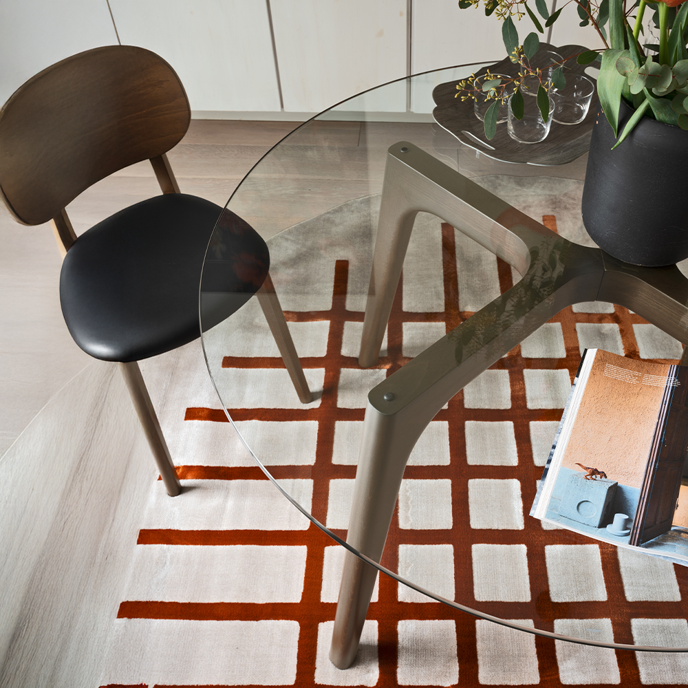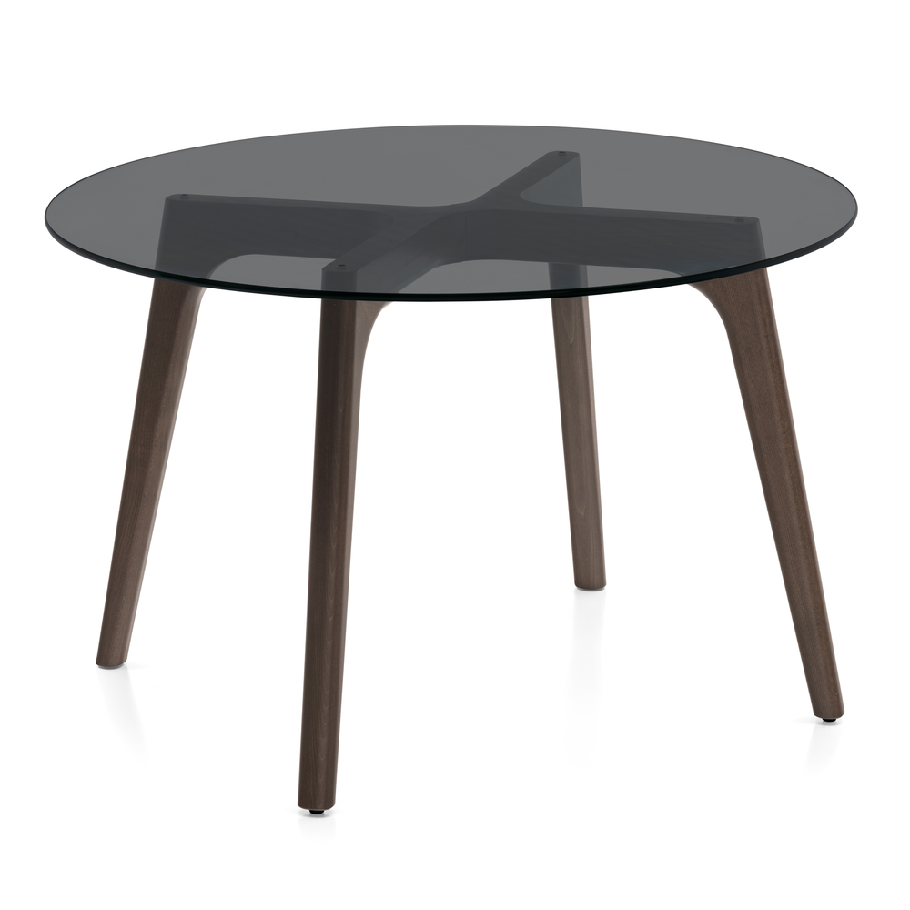 La base in faggio garantisce stabilità e resistenza, mentre il piano rotondo in vetro temperato è disponibile nelle finiture trasparente o grigio fumé, offrendo diverse possibilità di abbinamento.