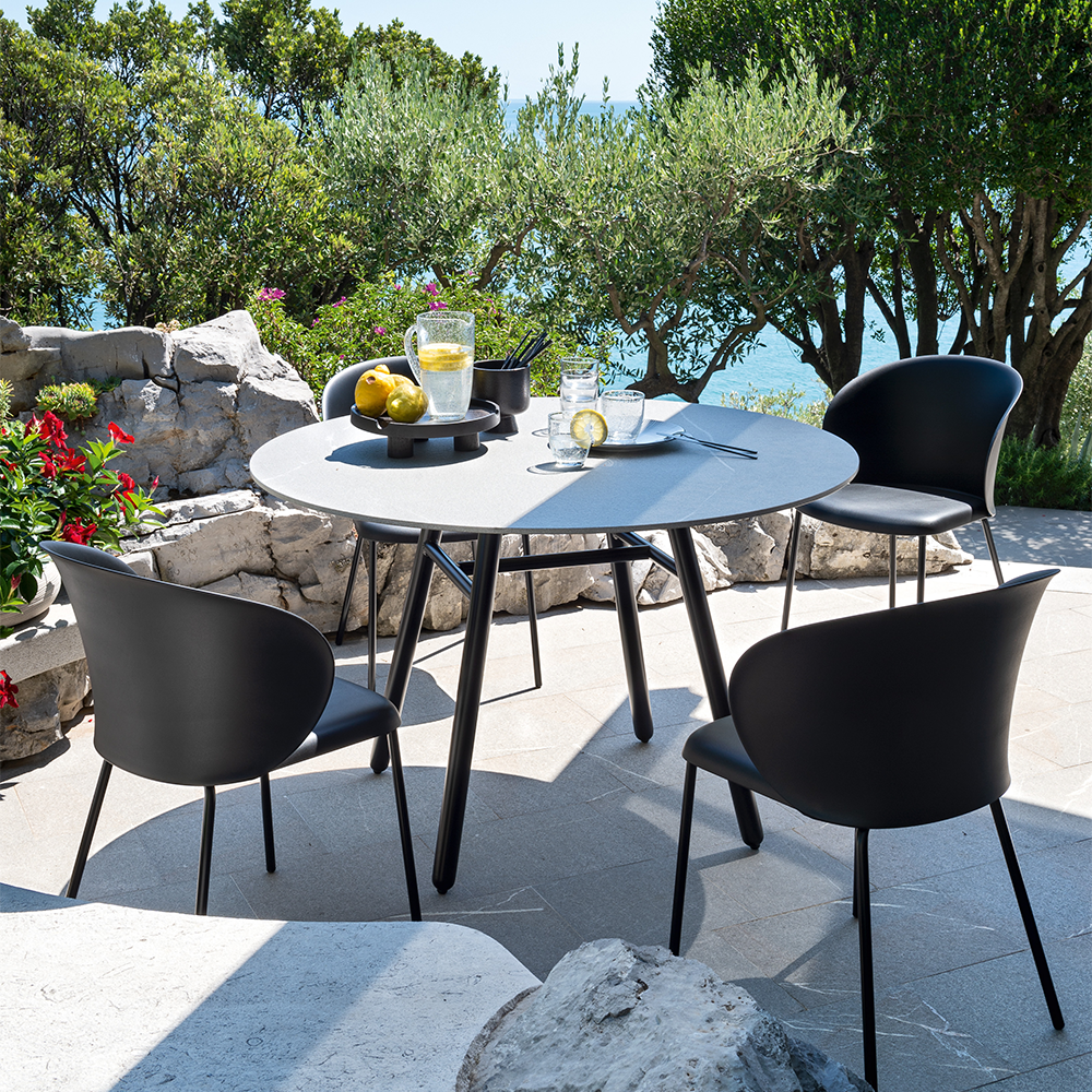 Tavolo fisso rotondo con struttura in alluminio e piano in ceramica piasentina grigio opaco.
