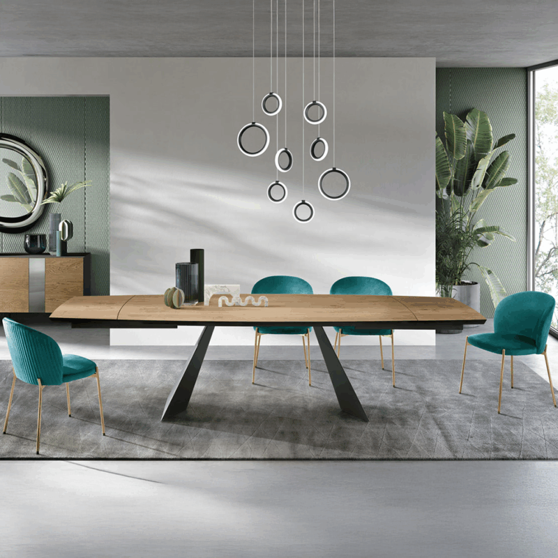 Il legno impiallacciato unisce estetica e praticitร mentre la combinazione tra metallo e rovere lo rende adatto a diversi stili di arredo.
