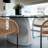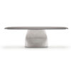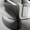 Gran Sasso รจ il tavolo di Midj realizzato con base centrale in Baydur o Baydur effetto cemento spatolato, inserto centrale in cuoio e piano sagomato a botte in vetro oppure in cristalceramica.