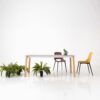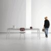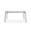 La struttura รจ disponibile in alluminio verniciato o acciaio inox, con la possibilitร di personalizzazione con gambe in legno. Il tavolo rettangolare consente di ottimizzare lo spazio e di adattarsi facilmente a diverse esigenze di arredo.