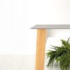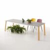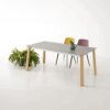 Nella versione con angoli a 90ยฐ, il piano รจ realizzato in melaminico o cleaf, con unโallunga di serie nella stessa finitura e una seconda allunga opzionale, anche in finitura diversa, scegliendo tra melaminico o cleaf.